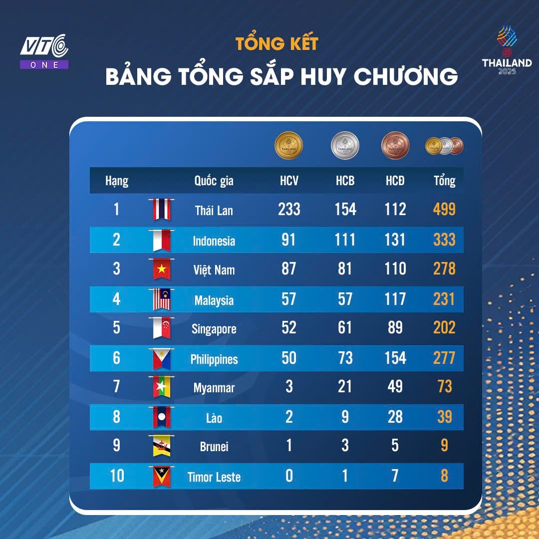 Khép lại kỳ đại hội, Đoàn Thể thao Việt Nam giành vị trí thứ 3 toàn đoàn, với tổng cộng 278 huy chương, gồm 87 Huy chương Vàng, 81 Huy chương Bạc và 110 Huy chương Đồng. Thành tích này phản ánh sự chuẩn bị nghiêm túc, tinh thần thi đấu quyết tâm và nỗ lực bền bỉ của các vận động viên Việt Nam, tiếp tục khẳng định vị thế của thể thao Việt Nam tại đấu trường khu vực.