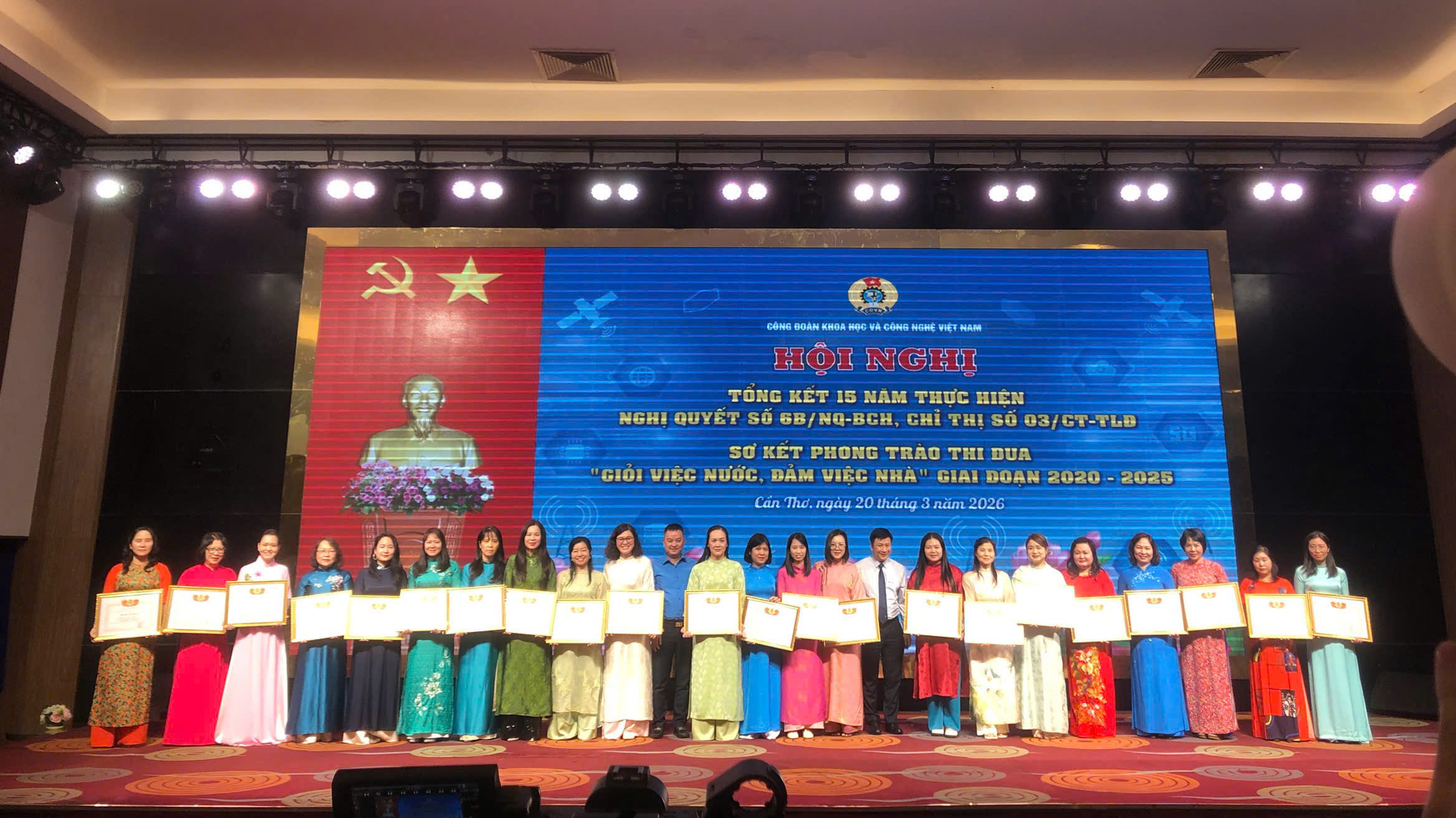 Sáng 20/5, tại TP. Cần Thơ, Công đoàn Khoa học và Công nghệ Việt Nam tổ chức Hội nghị tổng kết 15 năm thực hiện Nghị quyết số 6B của Ban Chấp hành Tổng Liên đoàn Lao động Việt Nam (khóa X) về công tác vận động nữ công nhân, viên chức, lao động (CNVCLĐ) trong thời kỳ công nghiệp hóa, hiện đại hóa đất nước; đồng thời sơ kết phong trào thi đua “Giỏi việc nước, đảm việc nhà” giai đoạn 2020–2025.