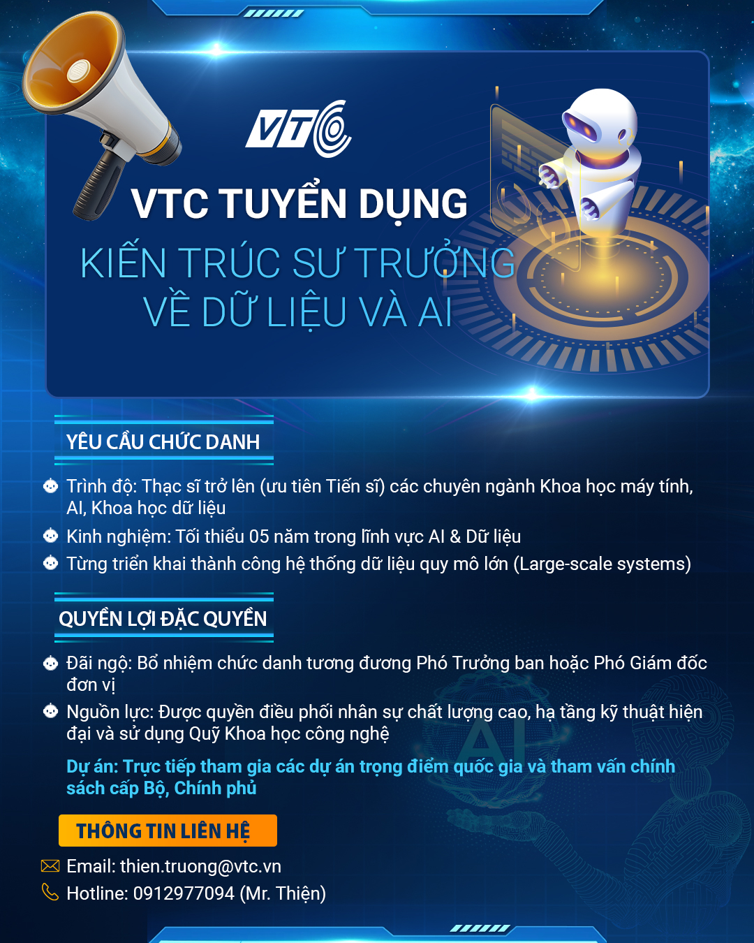 Tổng Công ty Truyền thông Đa phương tiện VTC cần tuyển Kiến trúc sư trưởng dữ liệu & AI với các tiêu chí: